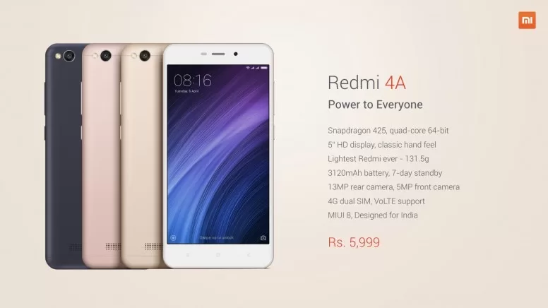 Xiaomi ने एंट्री लेवल स्मार्टफोन रेंज में अभी तक की सबसे लो-कॉस्ट डिवाइस Xiaomi Redmi 4A लॉन्च की है, जो 5,999 रुपए की प्राइस-रेंज में इंडिया में उपलब्ध होगी। शियोमी का यह नया स्मार्टफोन रिलायंस जियो 4जी नेटवर्क को सपोर्ट करेगा, और 3 कलर ऑप्शंस डार्क ग्रे, गोल्ड और रोज गोल्ड में मिलेगा।