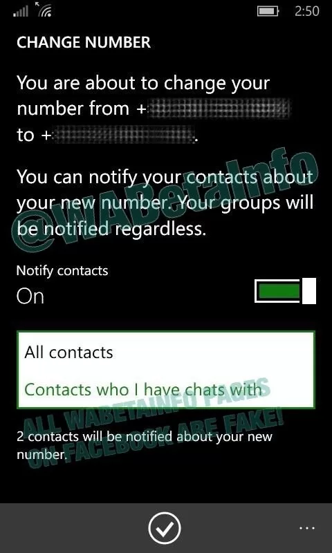 The First feature that the company is working on a notification option to notify your contacts when you change your contact number. The option is under test for WhatsApp Beta version 2.17.130 on Windows Phone update. The option has two settings, the first to notify to all your contacts and the second to notify the contacts you have chat conversations with.