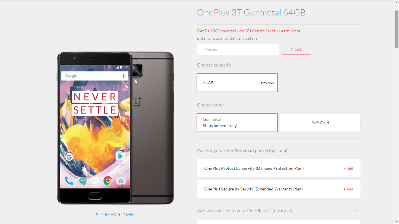 The Chinese company has now announced a limited period cashback offer on the smartphone. Interested buyers of the OnePlus 3T 64GB variant can get Rs. 1,500 cashback when using SBI credit card for the purchase through the company’s official online store.