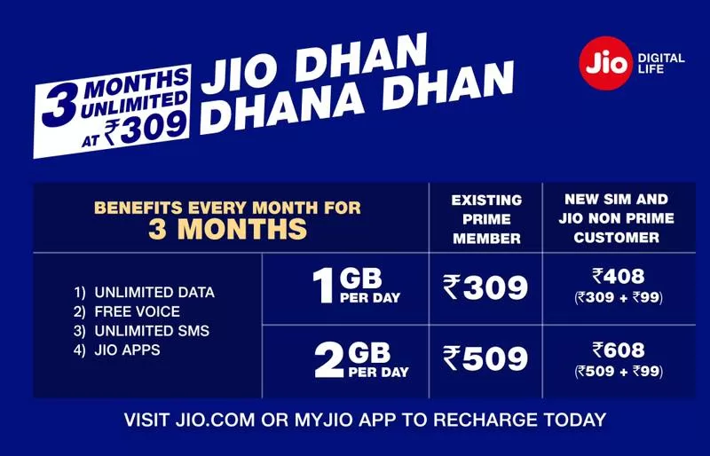 Reliance Jio Dhan Dhana Dhan offer : Get Unlimited data for 3 months at ₹ 309