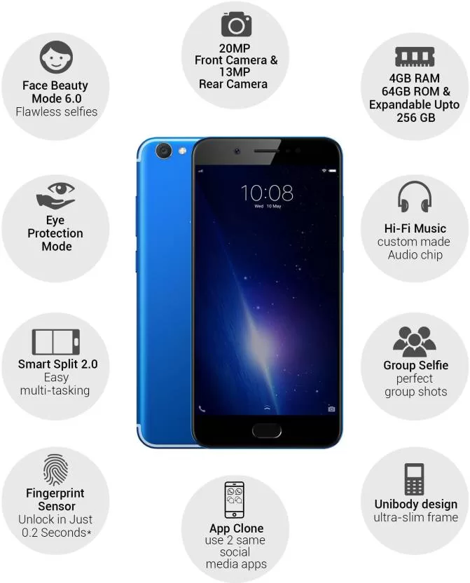The Vivo V5s is offered with 64GB of inbuilt storage, which is expandable via microSD card (up to 256GB) in a hybrid dual-SIM format. Connectivity options include 4G VoLTE, Bluetooth v4.0, Wi-Fi 802.11 b/g/n/ac, Micro-USB with OTG, GPS/ A-GPS, and a 3.5mm headphone jack. Sensors include an accelerometer, ambient light sensor, digital compass, proximity sensor, and a virtual gyroscope. The handset runs on a 3000mAh non-removable battery, weighs 154 grammes, and measures 153.8×75.5×7.55mm.